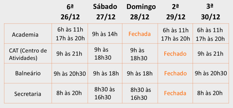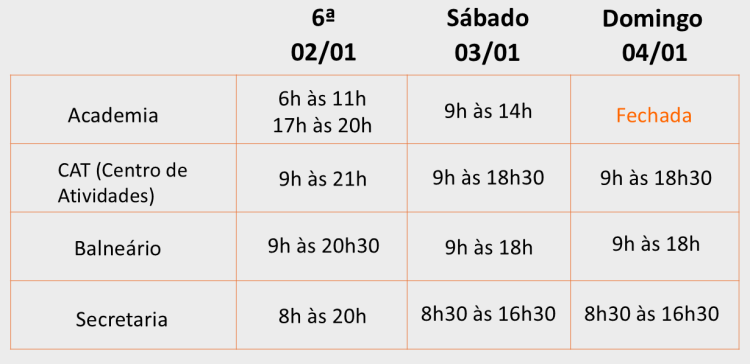 | Ginástica 30' | Alongamento | 3ª,5ª e 6ª às 8h 3ª e 5ª às 19h |