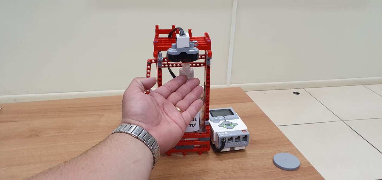 Inicialmente, a ideia era montar um projeto com Arduíno, devido ao baixo custo das peças. Mas, diante da necessidade de agilidade, eles criaram um robô com peças LEGO, que leva menos tempo de produção. Além disso, o produto possui um sensor ultrassônico e um motor, que mede a distância mínima para sua execução.