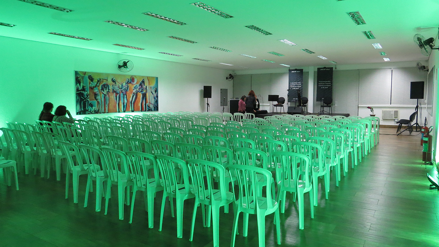 Equipamento de som e tela de projeção – espaço para coffee – banheiros - (masc/fem ).